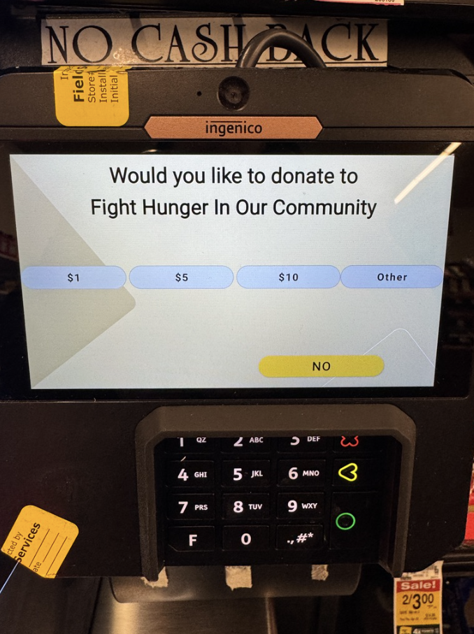 Checkout screen at a grocery store asking, “Would you like to donate to fight hunger in our community?” with options for $1, $5, $10, other, and a highlighted “No” button.